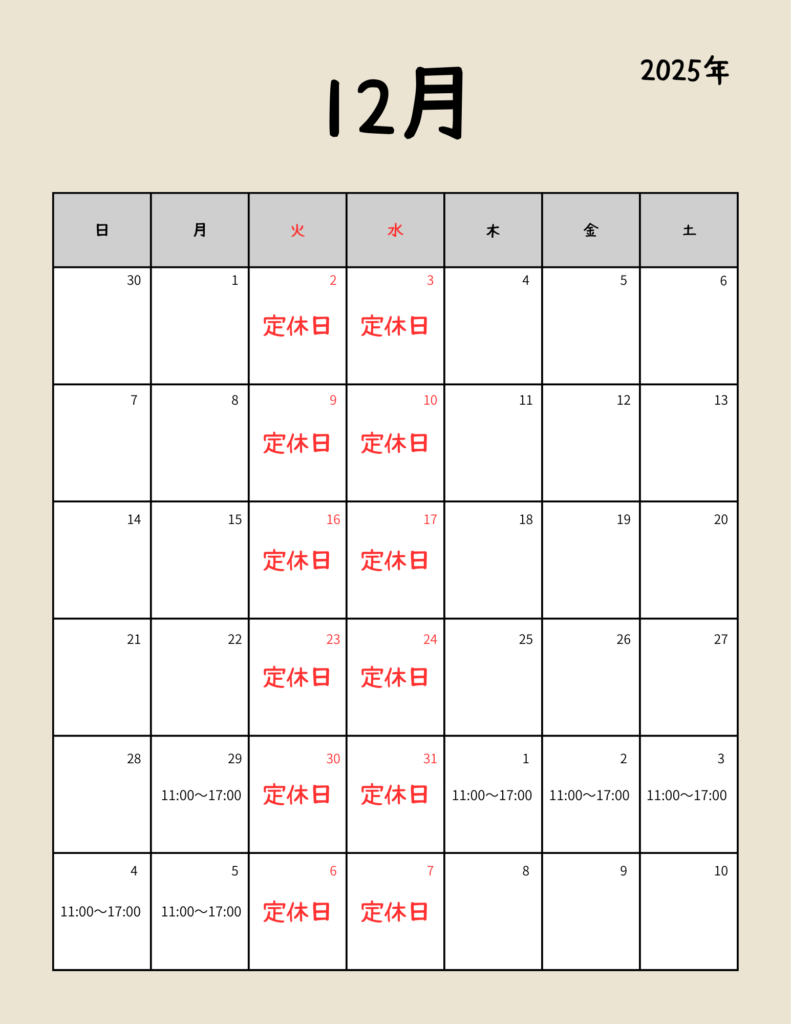 休みは通常通り火曜・水曜で1月1日から営業します。